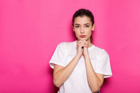 Young Attractive Woman Brunette In In A white T-Shirt, Sweater On pink Background, Gentle Female Folded Her Hands Together, Takes At Chest. The Concept Tenderness, Mercy And Kindness Of People