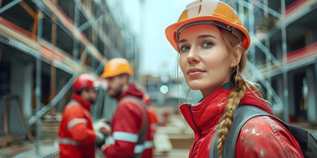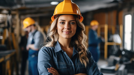 Confident female engineer wearing safety gear stands at a busy construction site with team members in the background. Leadership, teamwork, and construction industry concepts.