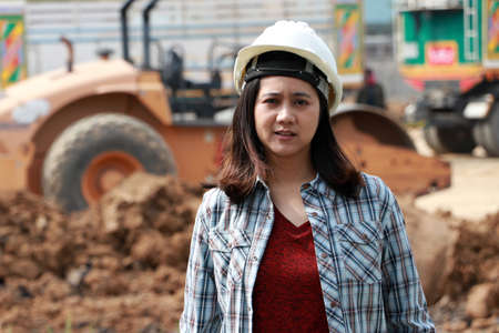 Female civil engineer with white helmet, standing with loader pedal car and pile of soil background in the work area.