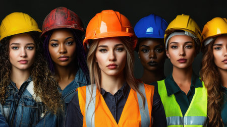 Six women of various ethnicities pose confidently wearing hard hats and safety vests against a dark background, showing their strength and teamwork in construction.