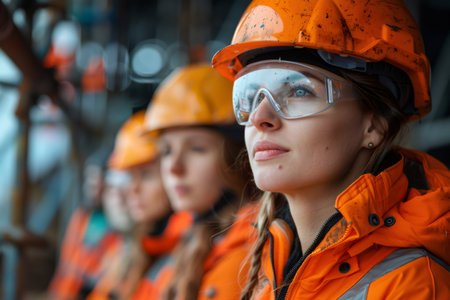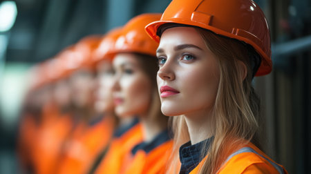 A group of young women wearing bright orange safety helmets and vests stands in a straight line displaying focus and determination. They are positioned in an industrial environment suggesting an active construction or renovation site. The daylight illuminates their faces highlighting their commitment to safety and teamwork