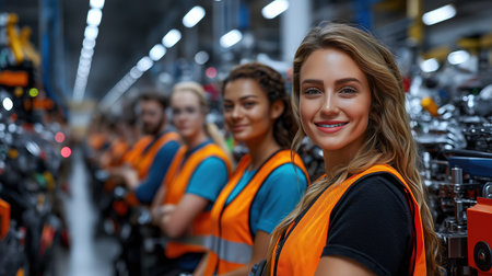 Photo of a diverse group of factory workers in pastel-colored uniforms, standing together in front of assembly lines, with space for text, captured with a 35mm lens at f/2.0, --ar 16:9 Job ID: 8418abd6-b2b8-49ba-b9bf-58ea6326ca9e