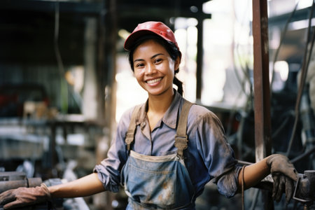 Female apprentice in metal working factory, Portrait of working female industry technical worker or engineer woman working in an industrial manufacturing factory company.