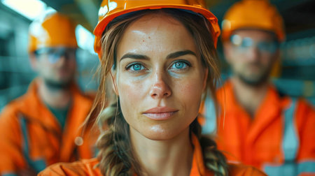 Confident African American Female Engineer with Team. Close-up of a confident African American female engineer wearing an orange safety helmet with her team in the background.