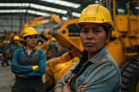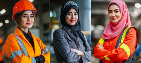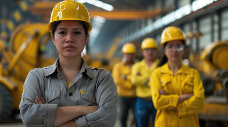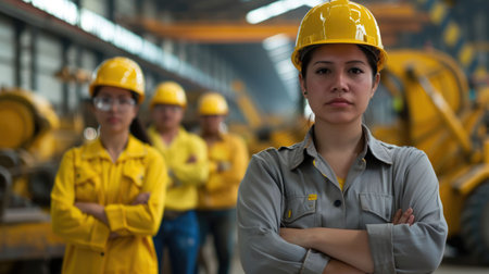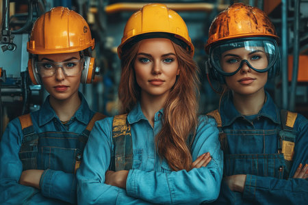 Women wearing protective helmets and gear pose with arms crossed in an industrial location. Their confident demeanor highlights the importance of female representation in engineering fields.