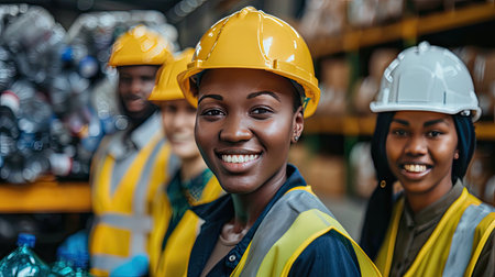 Portrait of group of smiling factory workers are in recycling plant for sorting deposit and plastic bottles background. AI Generated.