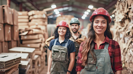Portrait of group of smiling factory workers are in recycling plant for sorting deposit and cardboard recycling factory stack of cardboard boxes background. AI Generated.