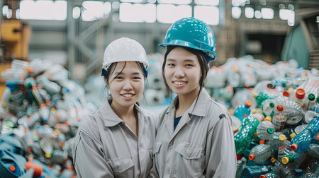 Portrait of two smiling factory workers are in recycling plant for sorting deposit and plastic bottles background. AI Generated.