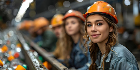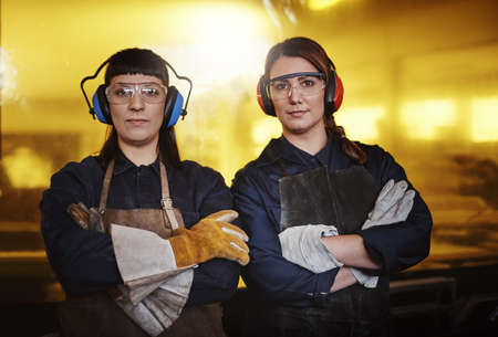 Confident female workers wearing hard hats and safety glasses in an industrial setting