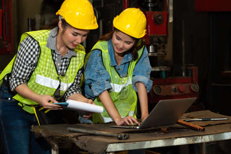Factory job workers working and discussing manufacturing plan in the factory . Industry and engineering concept .