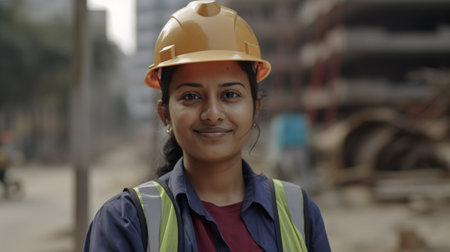 A smiling Indian female construction worker standing in construction site. Generative AI AIG19.
