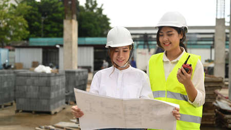 Asian female supervisor and architect checking plan inspect commercial building construction site.