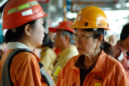 Two professional female engineers in safety helmets engage in a serious discussion at a busy industrial site
