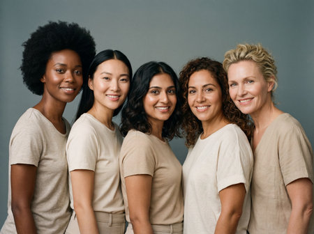 A diverse group of five happy women of different ethnicities stand together in a row smiling at the camera while wearing beige tops against a plain grey studio background representing unity and beauty.