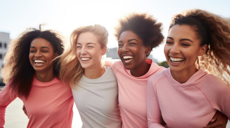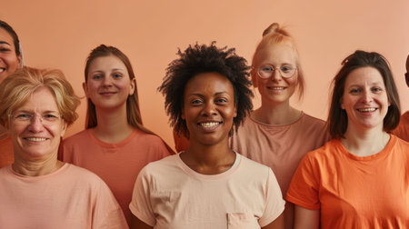 Diverse group of women wearing matching colors for a cause. Unity and strength concept with a focus on a smiling woman in the center.
