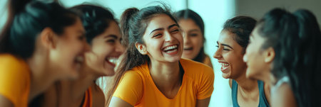 Sports, fitness and friendship: Group of young women laughing happily, dressed in sportswear