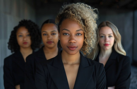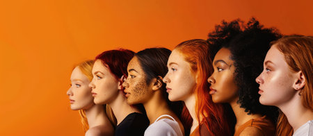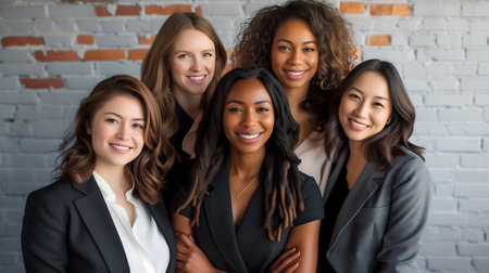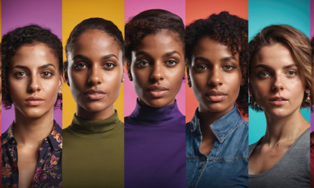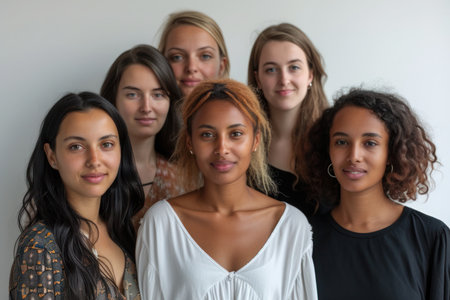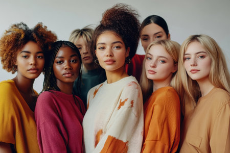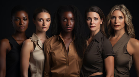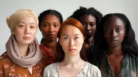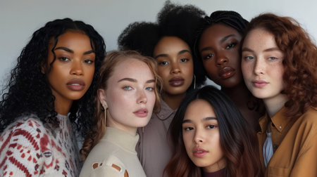 Diverse group of confident women standing side by side, showcasing different beauty and ethnic backgrounds. Unity and empowerment concept.