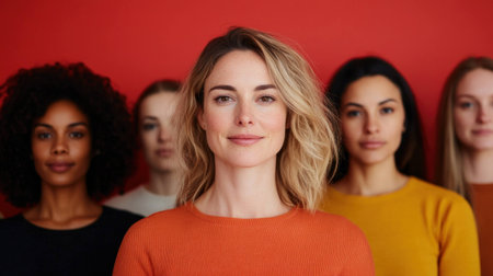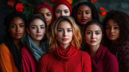 A diverse group of confident women showcasing individuality and empowerment, dressed in stylish sweaters against a vibrant red background, embodying strength and unity