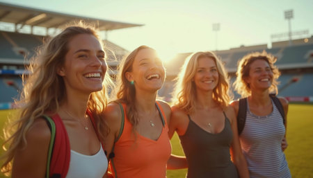 Four friends bask in the golden light of a sunset at a lively sports stadium, laughing joyfully together, creating unforgettable memories in a moment of pure happiness.