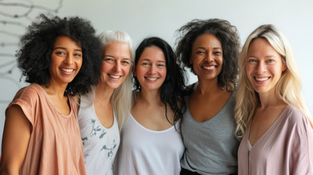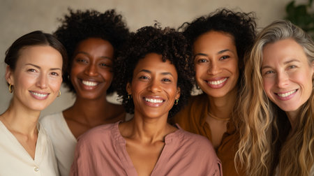 Group of diverse women smiling together. Concept of female friendship and empowerment. Multicultural gathering. Design for social media, advertisement, community event