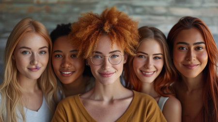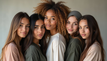 A stunning portrait featuring five women of different ethnicities, each radiating confidence and grace. Their harmonious expressions and stylish outfits create a powerful message of diversity and togetherness, celebrating individuality and shared strength.