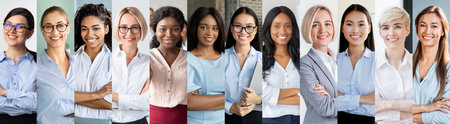Diverse group of women showcasing beauty and strength, with varying hairstyles and colors, demonstrating confidence, unity, and empowerment in contemporary fashion
