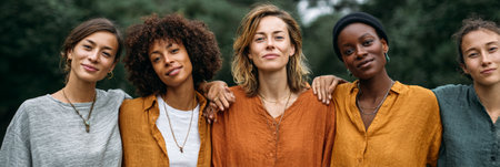 Five diverse young women standing together outdoors with arms around each other, embodying unity, support, and female empowerment in a natural setting
