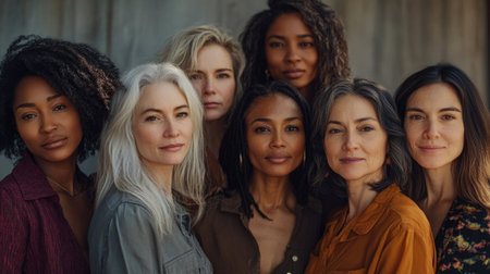 Diverse women of various ages standing together in unity and confidence, representing empowerment, equality, and support in a modern studio portrait.