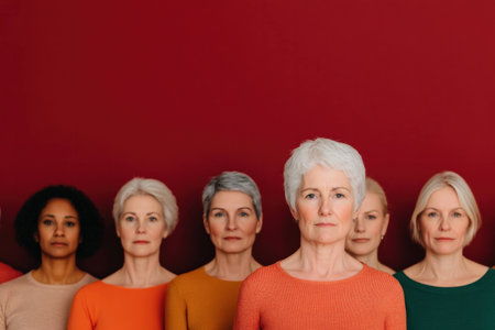 Diverse group of mature women with gray hair standing together on a bold red background, embodying confidence and solidarity in colorful attire, celebrating aging and beauty
