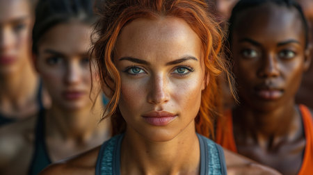 Diverse group of confident women standing side by side, showcasing different beauty and ethnic backgrounds. Unity and empowerment concept.