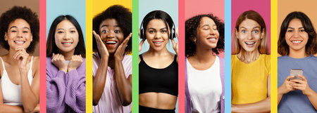Collage of five diverse multi-ethnic women smiling, captured in individual portraits against bright blue, yellow, and orange backgrounds.