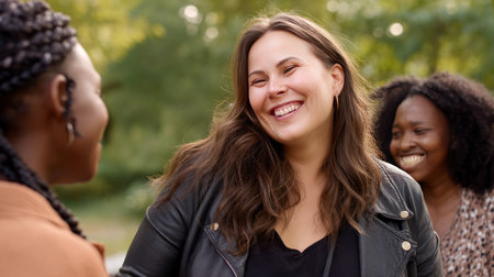 A confident plus-size woman laughing with her friends in a park, enjoying the moment of friendship