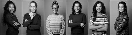 Seven businesswomen of different ethnicities are posing together in front of a gray background, representing diversity and female leadership in the business world