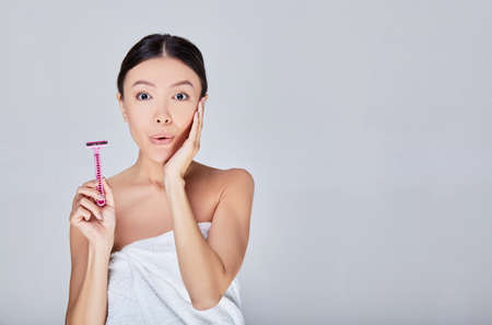 Beauty portrait of an attractive confused young asian topless woman standing isolated over gray background, holding a pink razor in hand. Copy space.