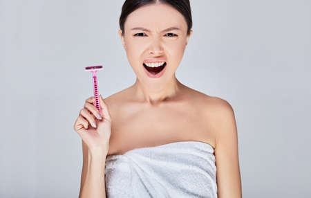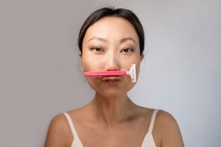 Young beautiful asian girl using a razor for hair removal, standing over isolated gray background screaming from fear, does not want to remove hair. Wax or shave.