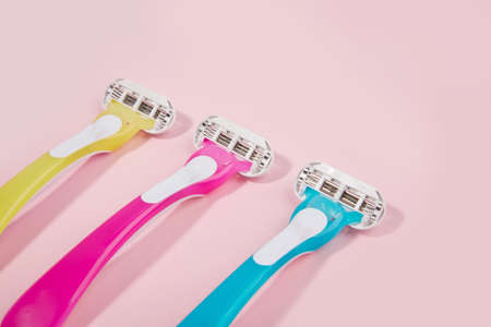 Razor for hair depilation. Body care. Three disposable razors on a pink background