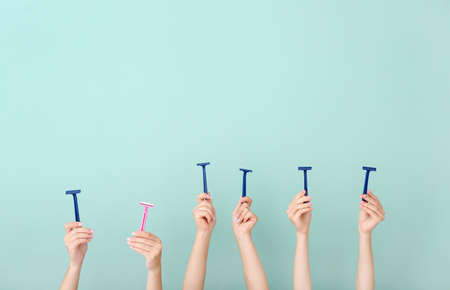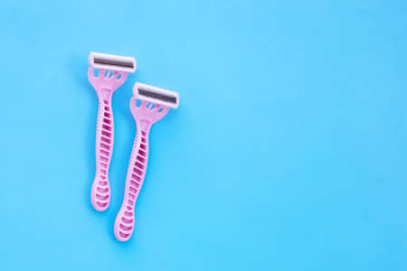 Beauty and fashion pop art concept. Many colored plastic razors on blue background. Minimalism