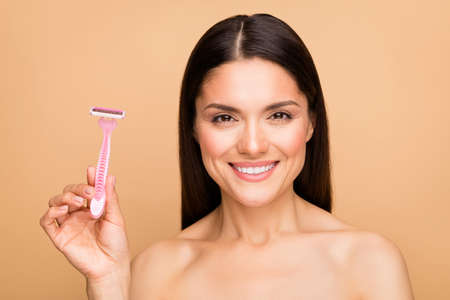 Closeup photo of mature latin naked lady in bathroom holding new shaver model recommending, good quality product advert isolated beige pastel color background