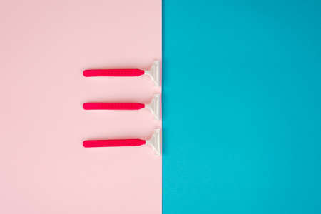 Upper Flat-Lay Image of Three Women's Colorful Pink Disposable Razors Shavers Placed Reversed Over Trendy Pink Coral Background. Horizontal Image