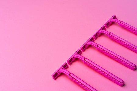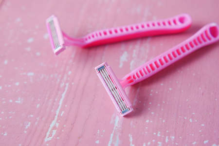 Woman pink plastic razor or stick on pink background. Disposable female shavers. Skin care.