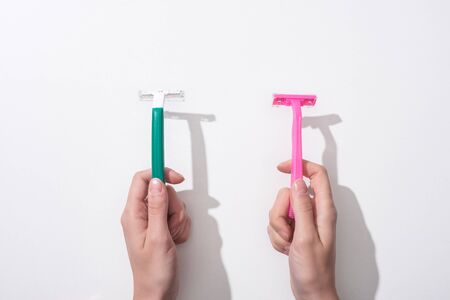 Beautiful young caucasian woman shaving her face by two razors on white background. Pretty woman with shaving foam on her face