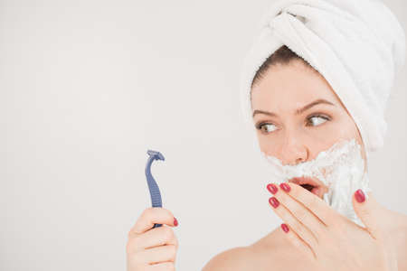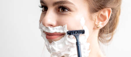 Beautiful young caucasian woman shaving her face by razor on white background. Pretty woman with shaving foam on her face