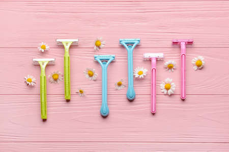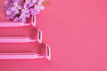 Safety razors and flowers on pink background, closeup hair removal from female body in summer