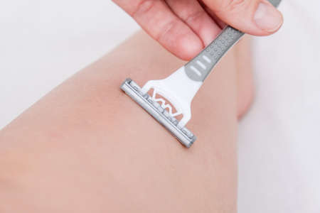 Woman shaving legs with a grey disposable plastic razor close up, unwanted hair removing
