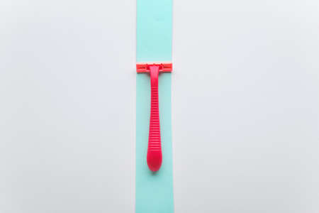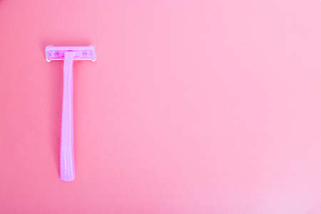 Disposable female razor on a pink background. A tool to remove hair from the skin. Female depilation and hygiene. Body care. Top view, copy space, stylish magazine concept