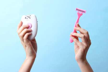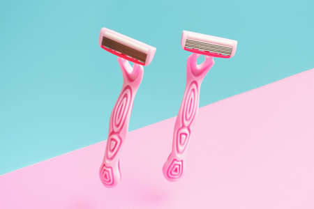 Set for hair removal. Blue and pink womans razor on the colorful background. Beautiful roses and pionies lying near the razors. Close-up of objects.
