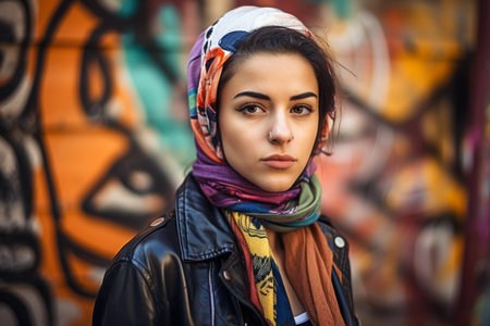 Portrait of a young woman with a colorful headscarf and a leather jacket, standing in front of a graffiti-covered wall with a fierce expression on her face