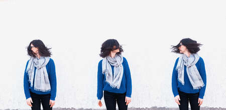 Creative collage with three young brunette women with flying hair in Classic blue sweater standing near white wall. Main trend concept. Place for text.