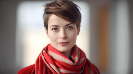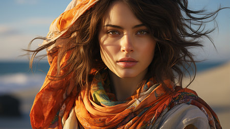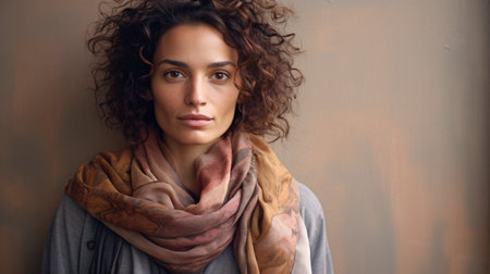 An AI-generated illustration of a young woman with curly hair and a stylish scarf posing for the camera