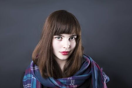 Autumnal outfit concept. Smiling female long hair wearing warm autumn clothing plaid woolen scarf, on dark